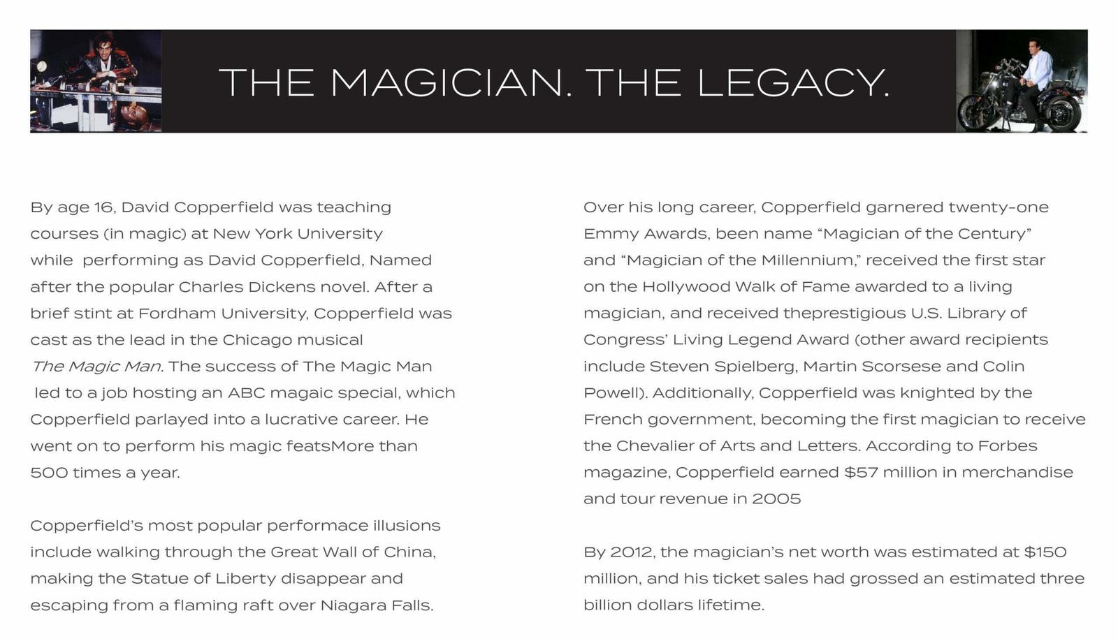 The Artistic journey Beyond the Curtain, examines the artistic displays of illusion that made David Copperfield one of the most profitable and well known magicians. It is a collection of his top ten most notable works that each represents a key point in his career, leading to his success as an artist. Explore the arts of magic as you take a journey into the past, before the Internet into the age of the 21st century. Learn the history of the “Living Legend”, what inspired him, and how David Copperfield became a winner of twenty-one Emmy Awards, eleven Guinness World Records, and the most profitable magician in recorded history in the world.